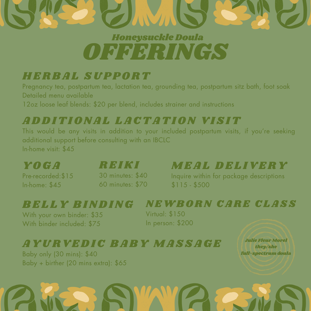 Centered on support after birth; can be added on in packages. Of note: postpartum is forever! Please don’t hesitate to reach out even if you are already several months postpartum. This care is always needed.